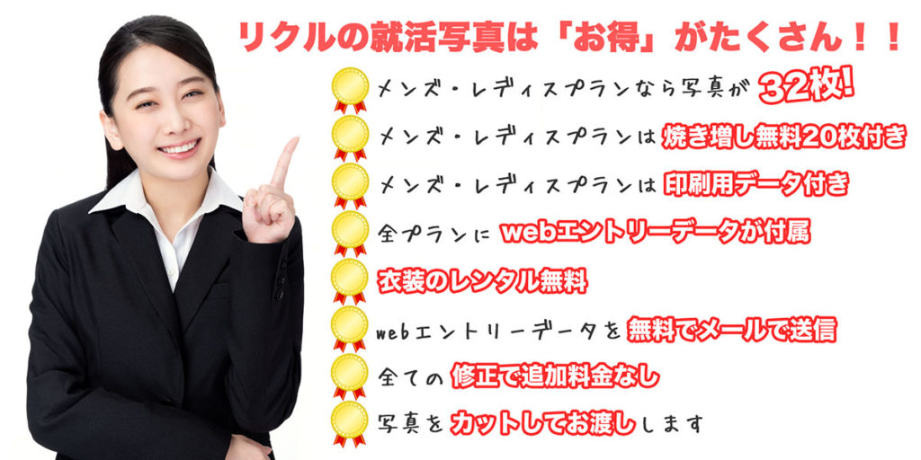 さらにレディスプラン・メンズプランでは、自分でも印刷できる印刷データも付いています。急に必要になった時などにコンビニなどで写真が印刷できるということらしいのですが、この印刷データがあれば証明写真いくらでも印刷できるんですね。多くの写真館では焼き増しで利益を上乗せしているようですが、リクルさんは商売する気あるのでしょうか・・